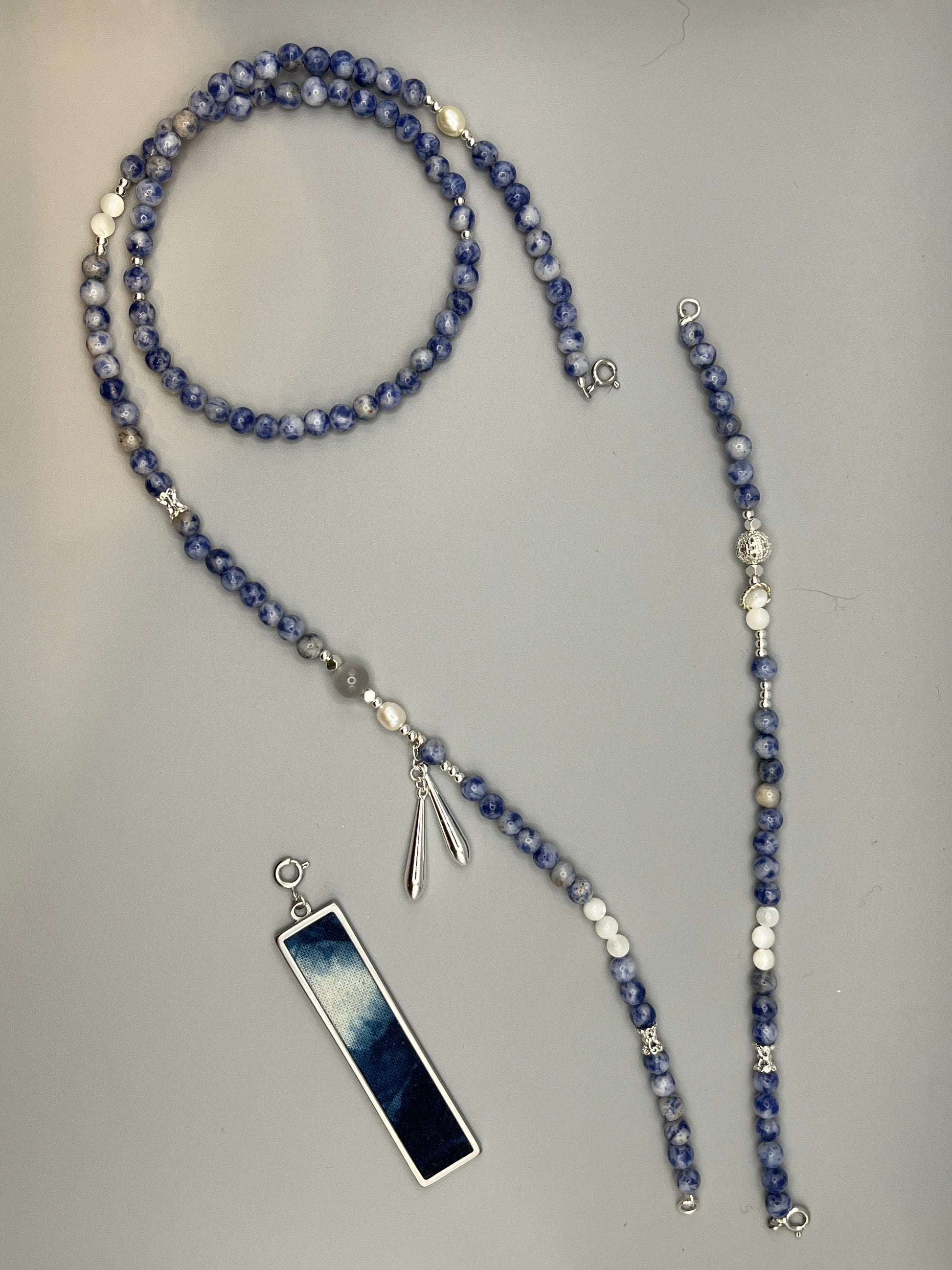 Paired with deep blue sodalite gemstones, each piece highlights the natural indigo tones of the batik art.